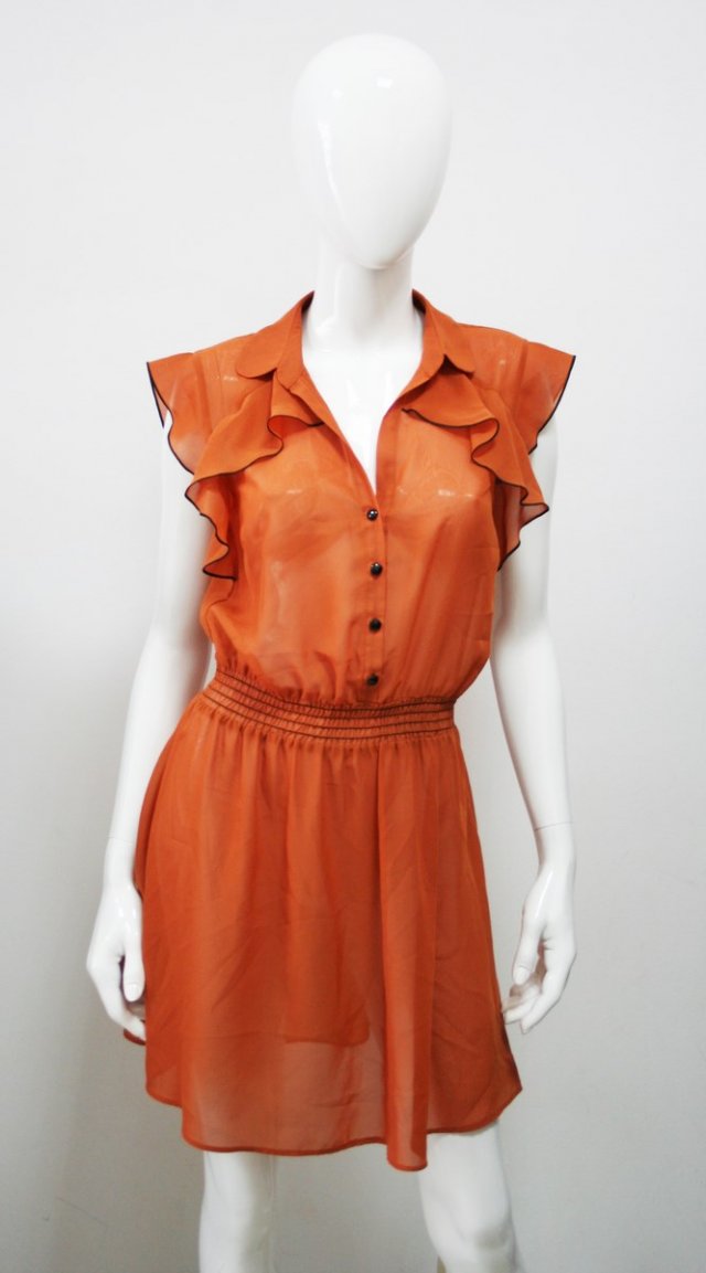 Sukienka, tunika mgiełka w brązowym kolorze.W pasie marszczona gumkami. Zapinana na guziki. Przy rękawkach falbanki z czarną lamówką. Okrągły kołnierzyk.