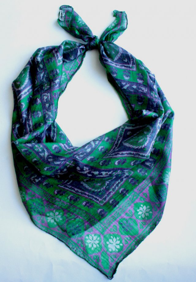 Subtelna chusta z delikatnego, cienkiego jedwabiu. Kolory to trawiasta zieleń z dodatkiem fioletu.