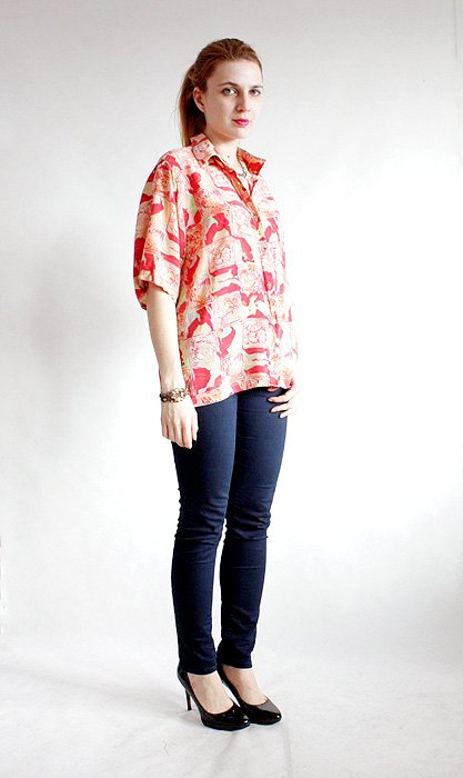Zapinana, wzorzysta bluzka ze stuprocentowego jedwabiu.