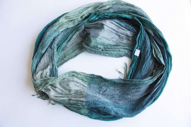 Piękny szal w przelewanych odcieniach niebieskiego, o rożnych fakturach, miejscami elastyczny. Wykonany z czystego jedwabiu.