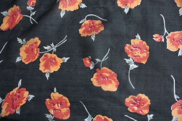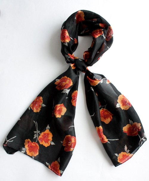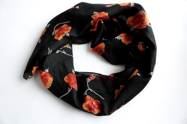 Jedwabny szal w kwiaty na czarnym tle.