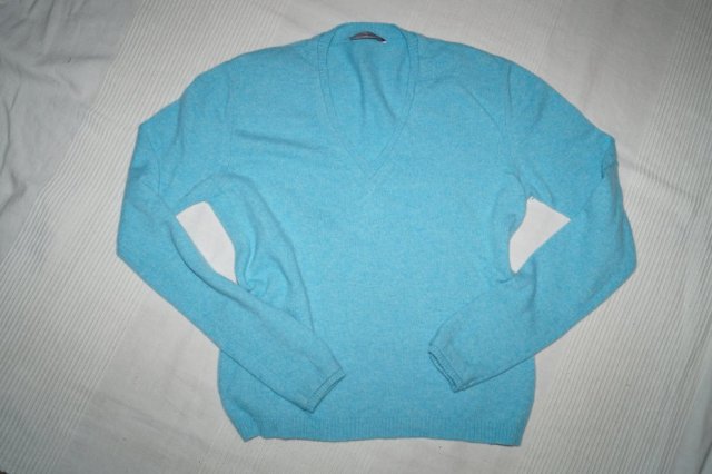 Uroczy kaszmirowy sweterk marki GC FONTANA ( dostępna w PEEK&CLOPPENBURG) w rozmiarze M, kolor błękitny ( delikatny melanż), miły w dotyku, ładnie się układa, lekko taliowany, dekolt w serek, wąskie ściągacze