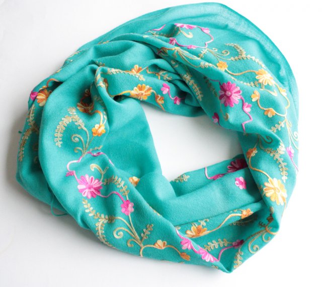 Piękny błękitny haftowany szal Pashmina wykonany w 100% z kaszmiru. Szal ma jaśniejszy pas widoczny na ostatnim zdjęciu, jednak nie jest to widoczne podczas użytkowania.