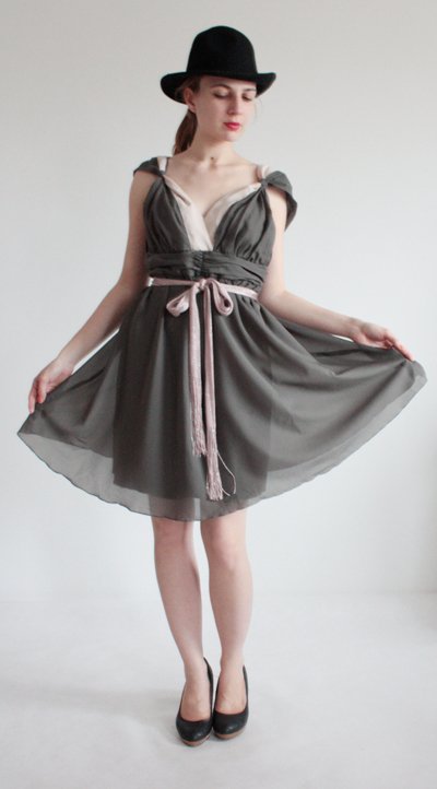 Przepiękna sukienka o niezwykle kobiecym kroju. Materiał oceniam na poliester (brak metek). Z tyłu wszyta gumka.