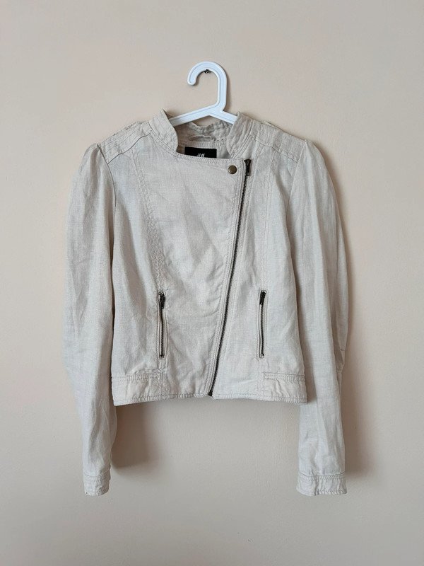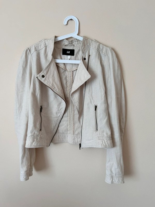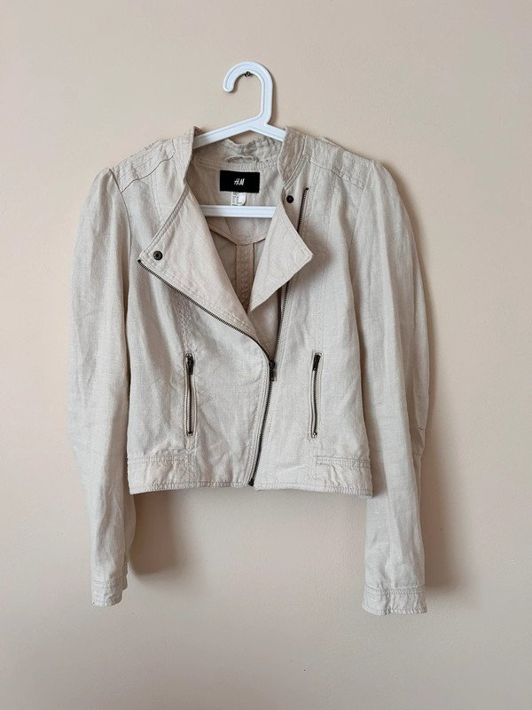 Jasna kurtka marki H&M, wykonana z 100% lnu. Rozmiar z metki to XL 42, ale moim zdaniem jest to S/M, więc proszę kierować się wymiarami. Kurtka ma prosty, ale elegancki krój, zapinana jest na zamek błyskawiczny. Posiada dwie kieszenie również zapinane na zamki, co dodaje jej praktyczności. Kurtka ma długie rękawy i jest w stonowanym, neutralnym kolorze, który łatwo dopasować do różnych stylizacji.