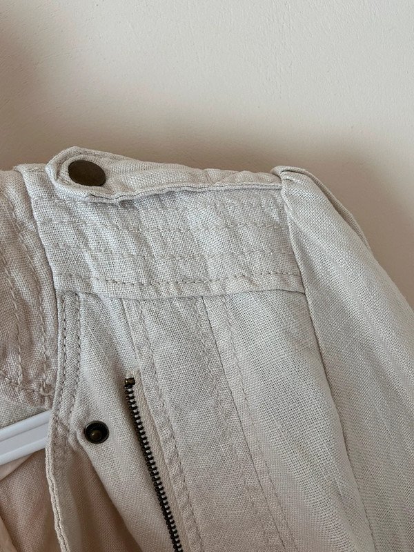 Jasna kurtka marki H&M, wykonana z 100% lnu. Rozmiar z metki to XL 42, ale moim zdaniem jest to S/M, więc proszę kierować się wymiarami. Kurtka ma prosty, ale elegancki krój, zapinana jest na zamek błyskawiczny. Posiada dwie kieszenie również zapinane na zamki, co dodaje jej praktyczności. Kurtka ma długie rękawy i jest w stonowanym, neutralnym kolorze, który łatwo dopasować do różnych stylizacji.