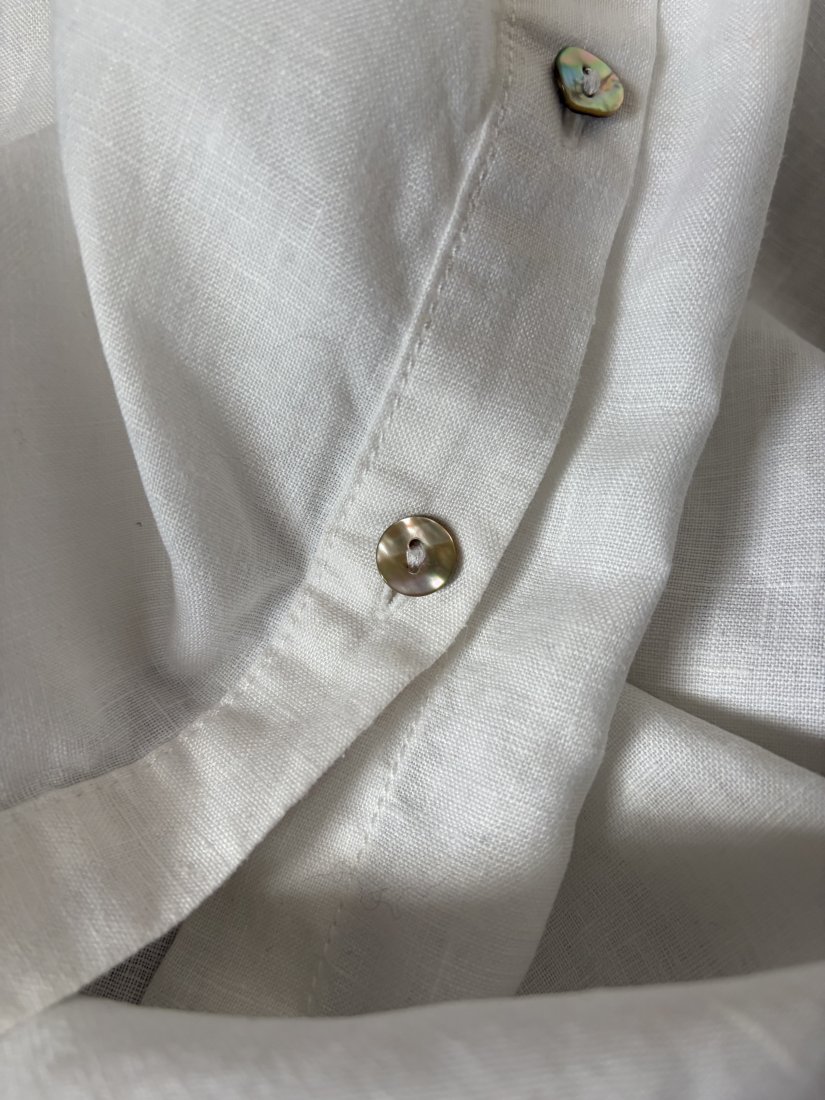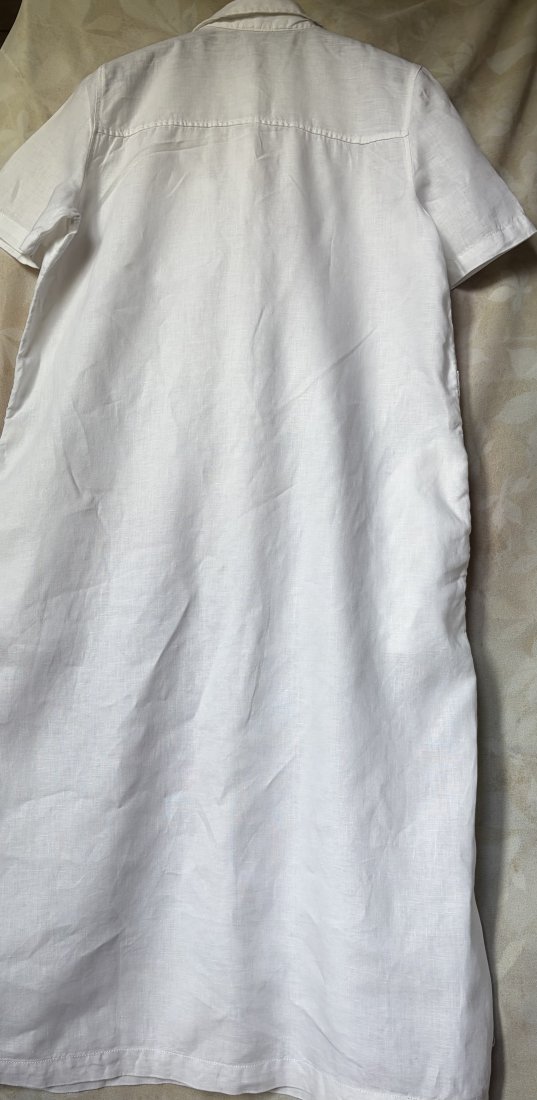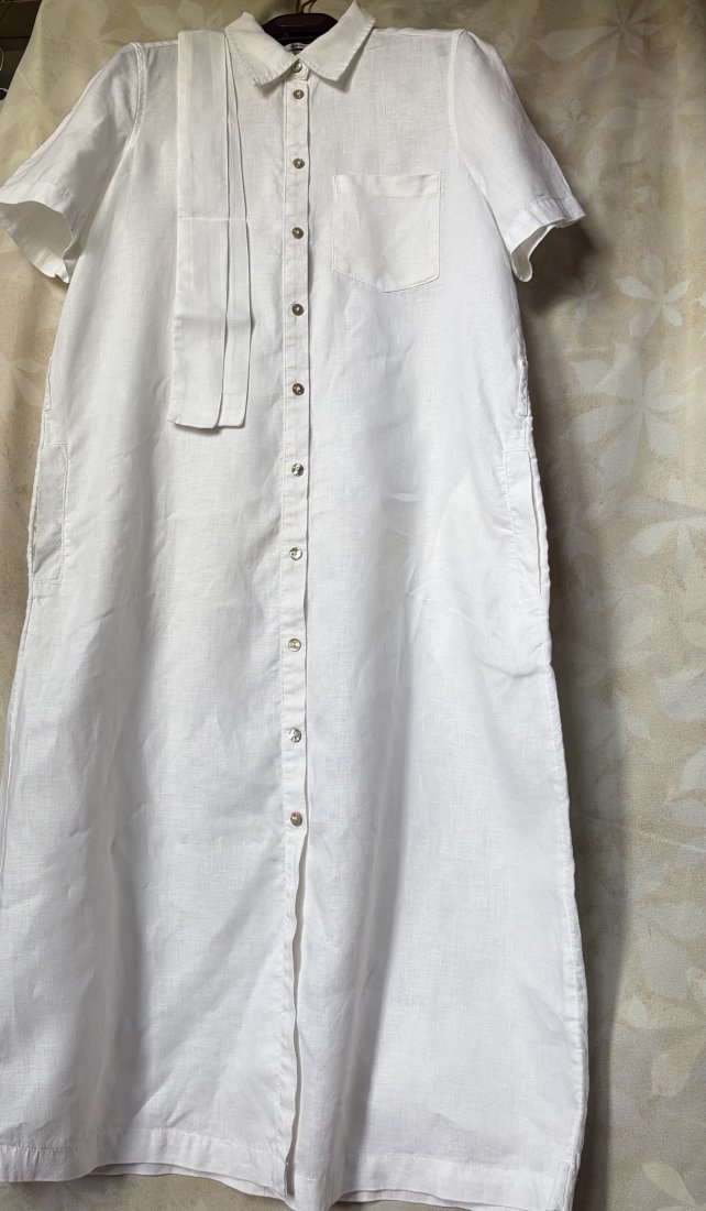 100% Linen .Długa, fartuchowa koszulowa z kieszeniami i paskiem zapinana , lniana …Kieszonka i efektowne guziki z masy perłowej Gatunkowy len . Ramiona 39 pachy 50 długość rękawa od ramienia 23,5 szerokość rękawa na dole 17 cm długość całkowita 116 dol około 62 pasek szer 5 długość 175 cm Stan zachowania bardzo dobry - minimalne ślady użytkowania . Wymiary mierzone na płasko .