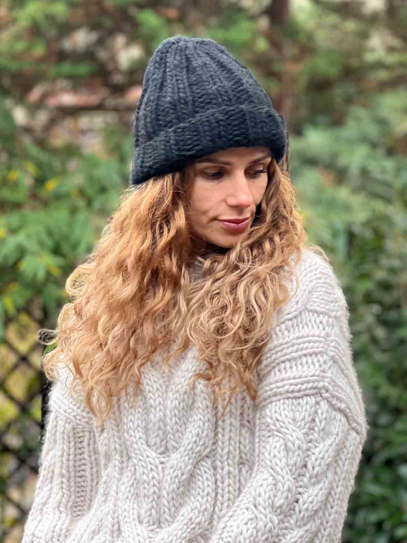 Unikatowa czapka wykonana została ręcznie na grubych drutach z najdelikatniejszej na swiecie wełny merynosow australijskich.