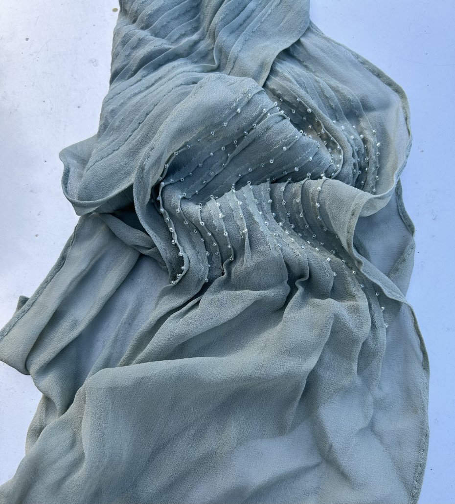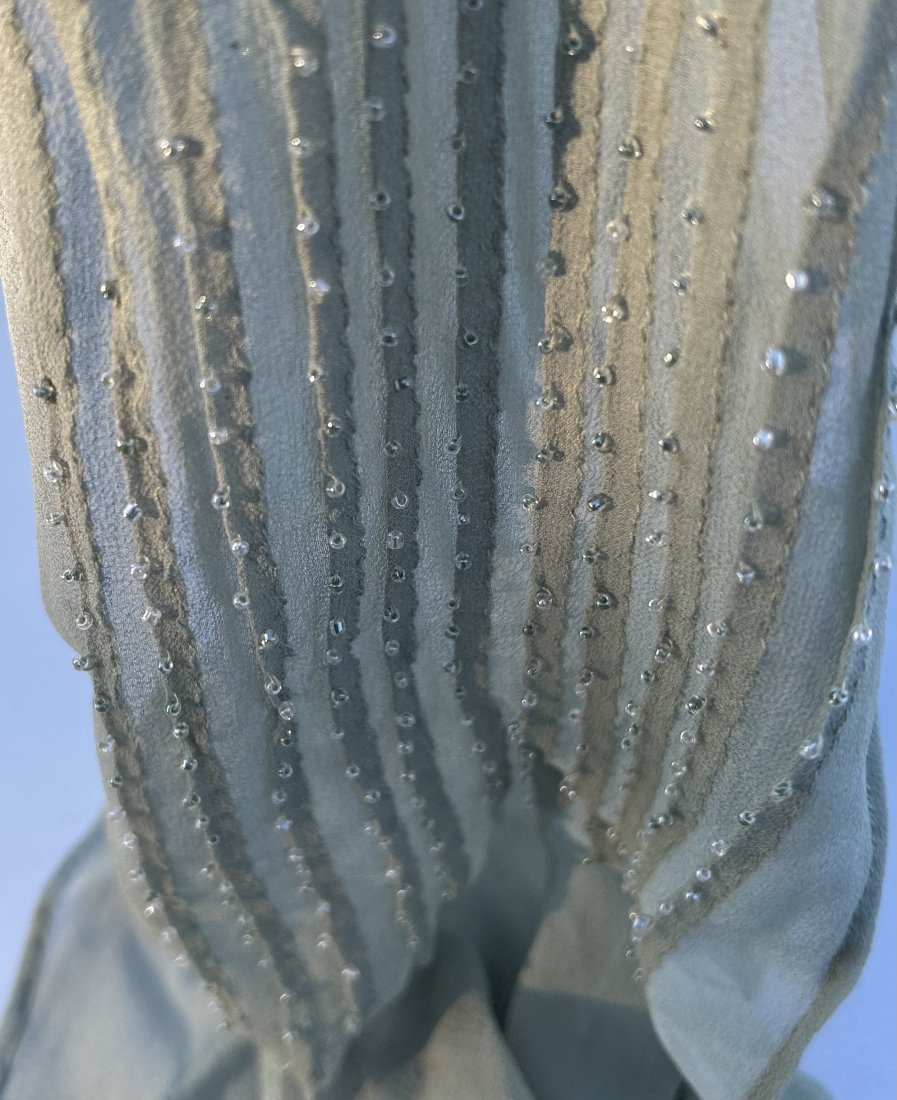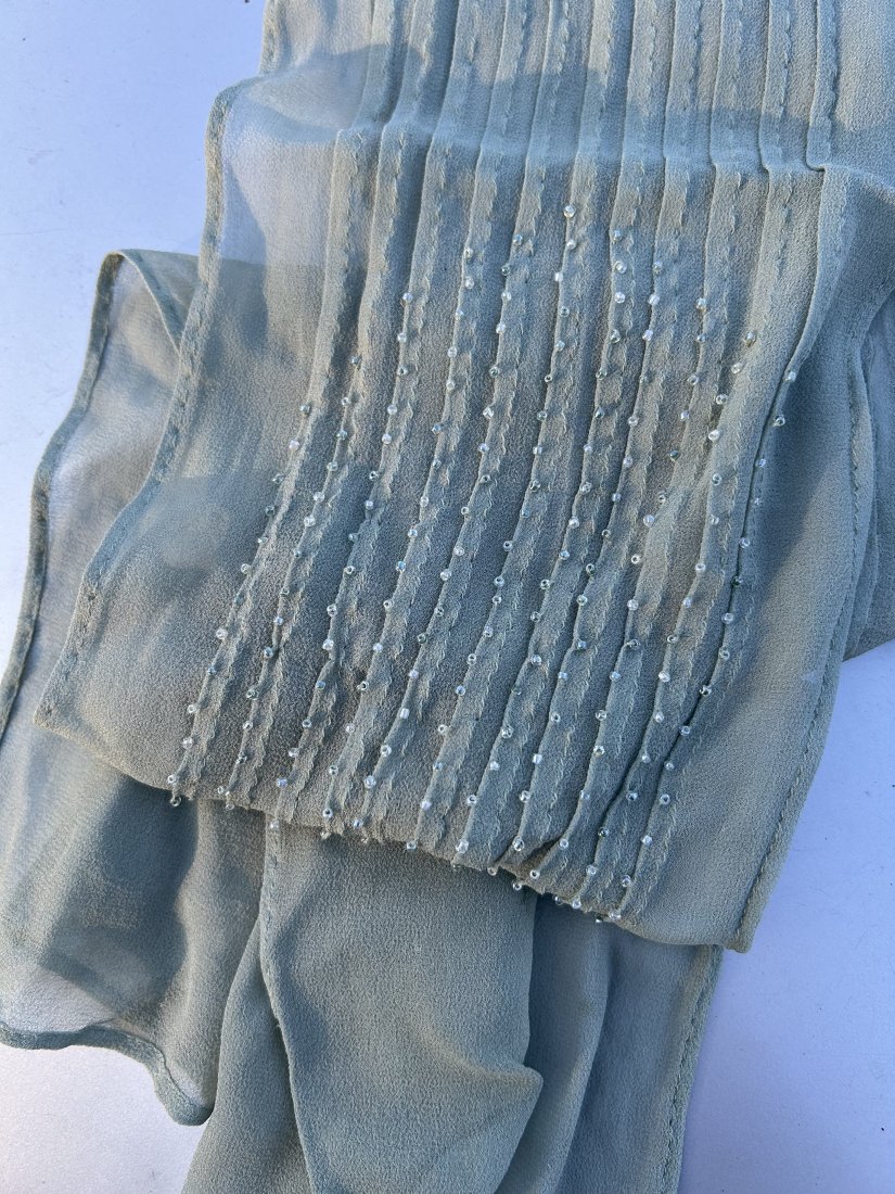 Metka - DEBUT - 100 % Silk - zdobiony koralikami , częściowo zszywany jakby plisowany - szal / szarfa . Elegancki , niespotykany . Długość 163 cm : szerokość w częściach wolnych od zdobień 31 szerokość w części zdobnej 20 cm . Stan. zachowania bardzo dobry