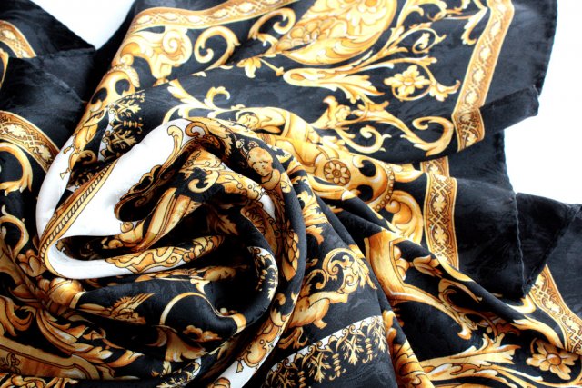 Przedstawiam Państwu luskusową, czarną chustę w stylu Versace, w miodowe wzory. Tkanina to stuprocentowy, delikatny, elegancki jedwab.