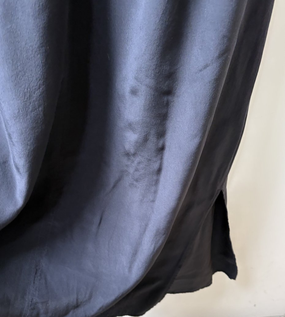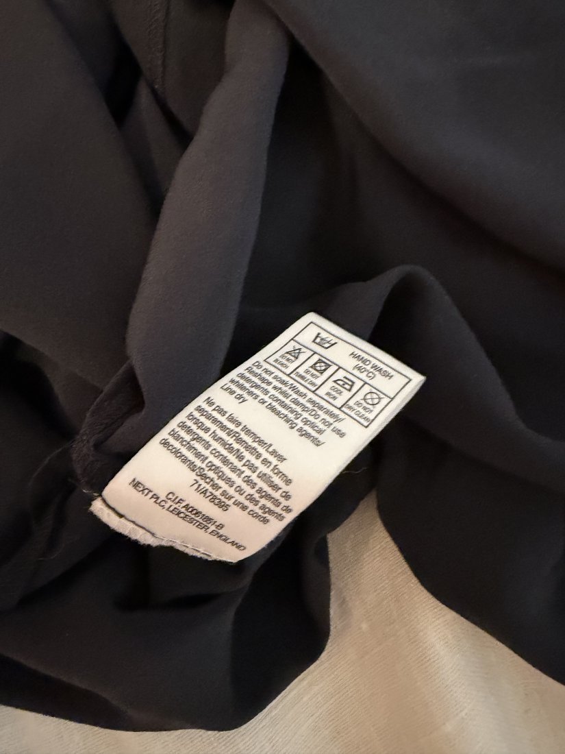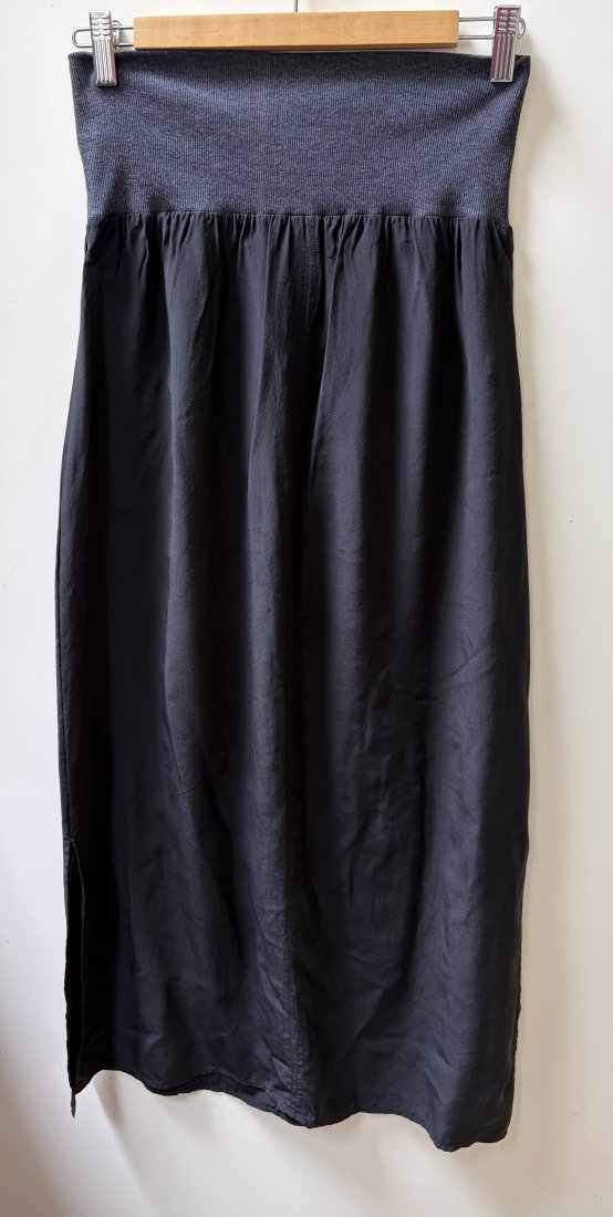 Jedwabna , jakościowa , granatowa spódnica. Rozcięcia na dole ,Na górze rozciągliwy ściągacz . Można nosić jako sukienkę . ściągacz na płasko bez rozciągania : 33 wys .11 cm . Biodra 55 dół około 60 cm rozcięcia na dole 34 cm długość całkowita 100 cm . Stan zachowania bardzo dobry . Metka ze składem obecna. Proszę o sprawdzenie wymiarów . Wymiary mierzone na płasko .