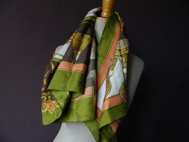 Renard - piękna duża jedwabna apaszka. Jedwab mięsisty, niezbyt cienki, chłodny, lejący, pięknie się układa. Motywy jeździeckie.