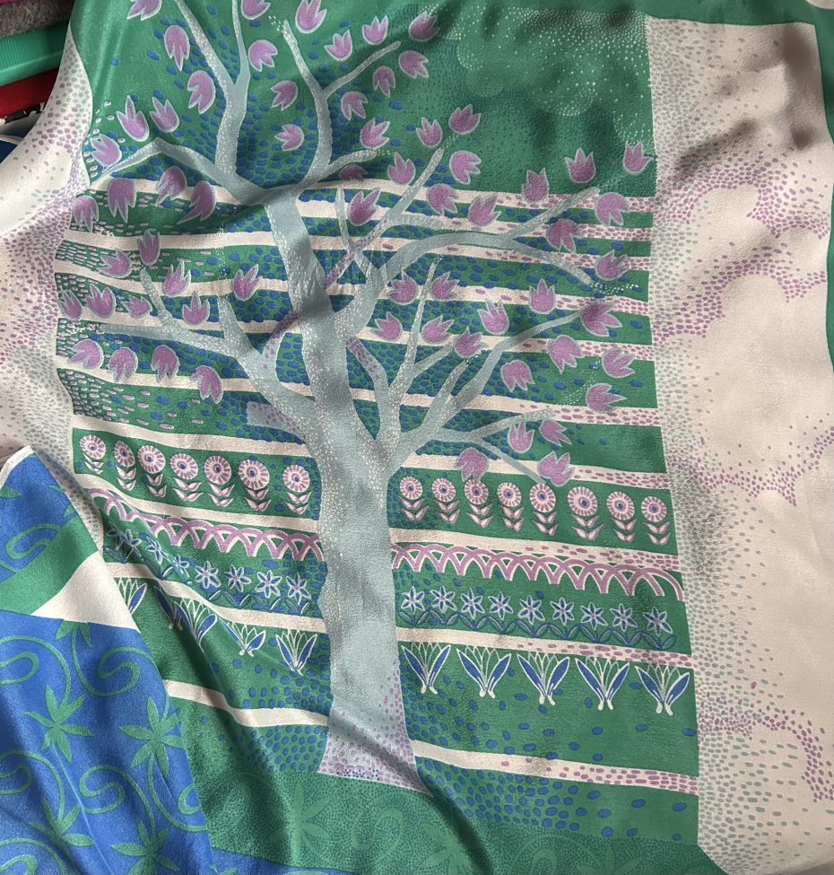 100 % SILK Made in France . Ciekawa jedwabna chusta - tulipanowe drzewo w fantastycznie złożonych barwach .wysoka jakość jedwabnej krepy . Metka : made in france 100% Silk . Bardzo przyjemna w dotyku, mięsista , satynowa lekko połyskująca. Stan zachowania bardzo dobry.