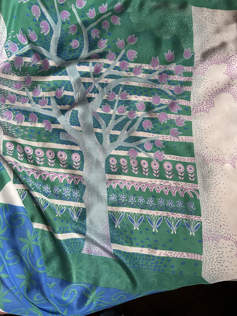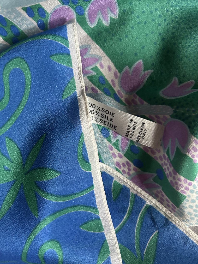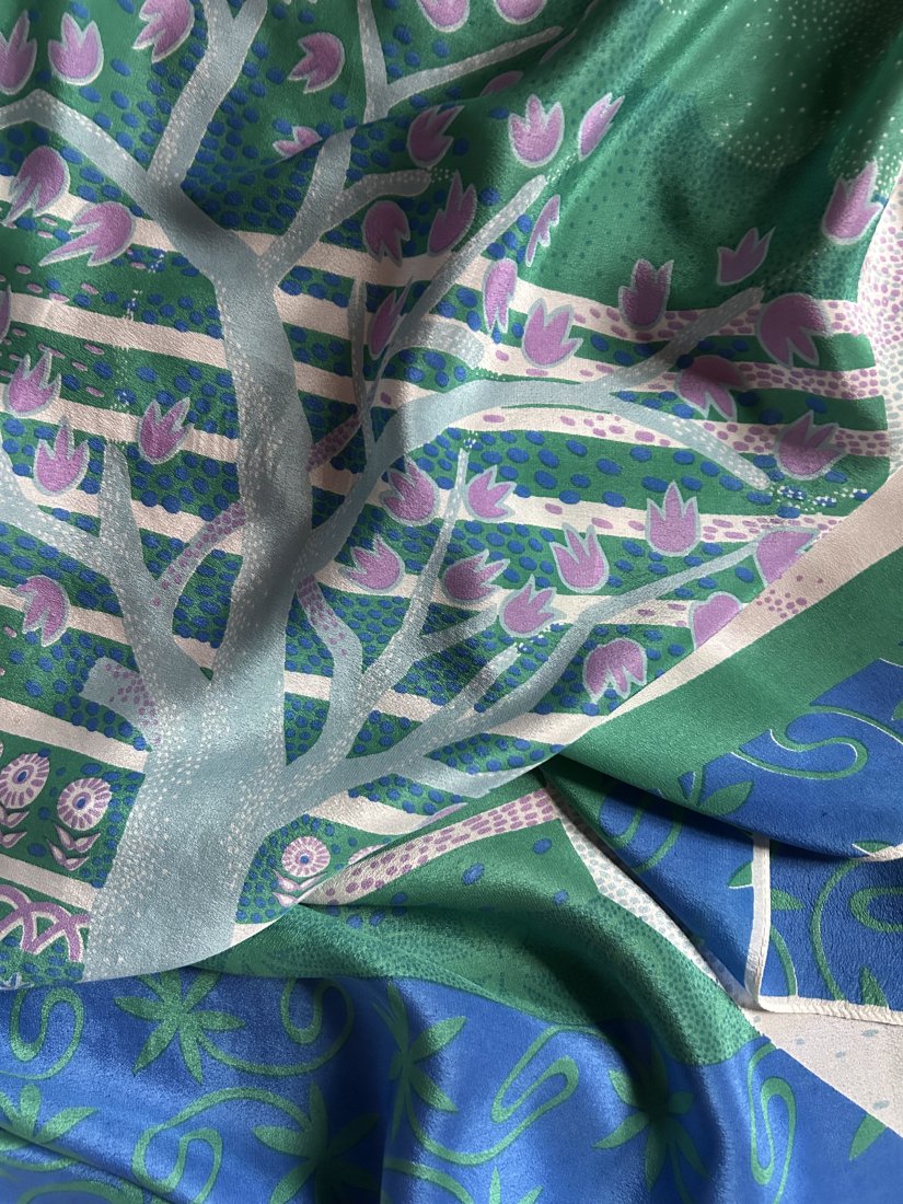 100 % SILK Made in France . Ciekawa jedwabna chusta - tulipanowe drzewo w fantastycznie złożonych barwach .wysoka jakość jedwabnej krepy . Metka : made in france 100% Silk . Bardzo przyjemna w dotyku, mięsista , satynowa lekko połyskująca. Stan zachowania bardzo dobry.