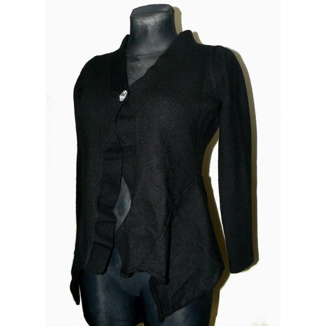 Czarne wełniane wdzianko, efektowne i cieple na chłodne dni. Dół skrojony fantazyjnie i nowocześnie. Zapinany na jeden duży guzik imitujący kryształ.