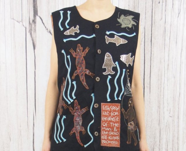 Niezwykła kamizelka w stylu etno od włoskiego projektanta Calugi e Giannelli. Prawdziwa perełka vintage. Zapinana na drewniane guziki. Naszywki ze skóry naturalnej i innych materiałów.