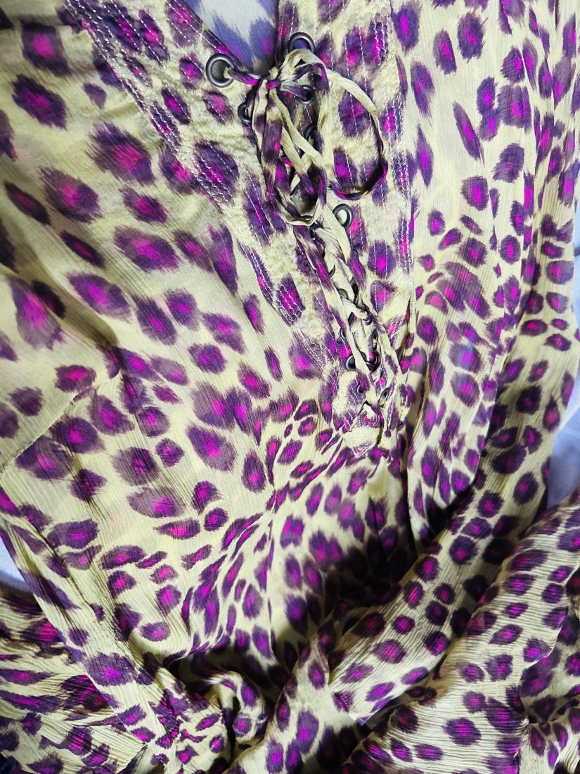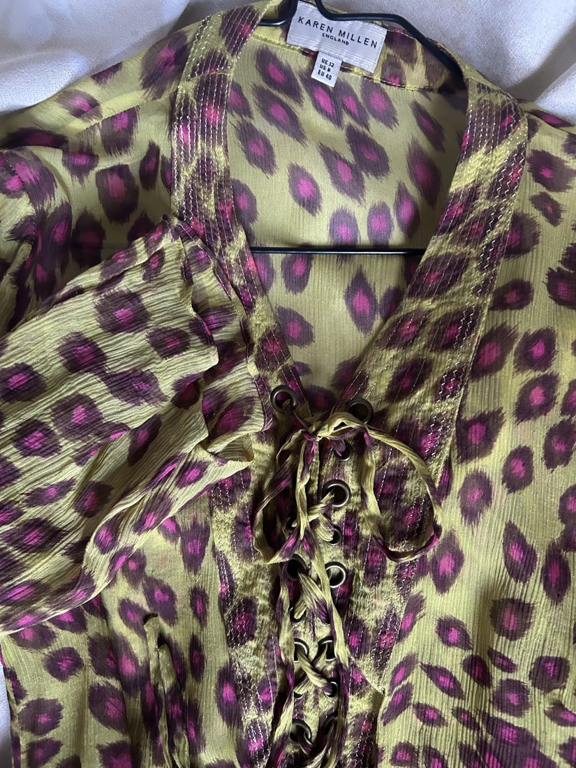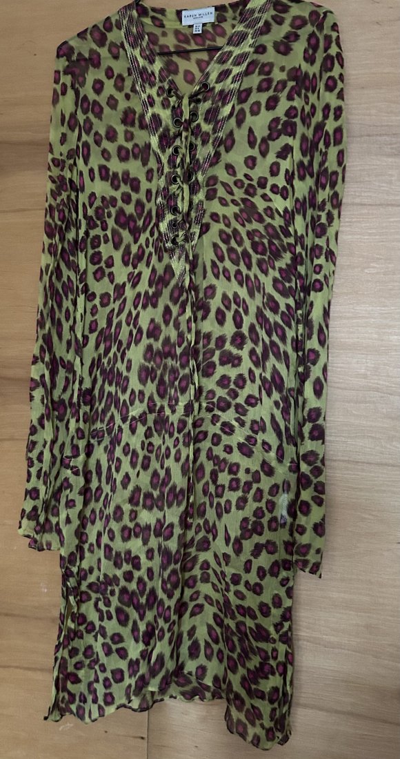 Efektowna , drapieżna, oryginalna jedwabna sukienka - tunika . KAREN MILLEN rozmiar UK 12 . Lekki jak mgiełka marszczony, lekko rozciągliwy jedwab, drapieżny print i oryginalne barw złożenie . Długi, lekko rozkloszowane przy nadgarstkach rękaw , ozdobne wiązanie z przodu . Złotymi nićmi obramowany dekolt .Na dole rozcięcia po bokach i od przyda lekko pobieżnej talii miejsce na wciągnięcie tasiemki ( której brak ) . Ramiona 50 cm pachy 43 długość rękawa około 68 szerokość rękawa na dole około 20 cm długość całkowita około 103 cm . Szerokość w miejscu gdzie jest miejsce na tasiemkę 50 cm rozcięcia po bokach 24 cm . Stan zachowania bardzo dobry - minimalne ślady użytkowania . Metka firmowa i metka ze składem obecne . Proszę sprawdzić wymiary w opisie . Uwaga !!! Kolory w realu najbliżej na zdjęciu numer 2