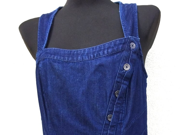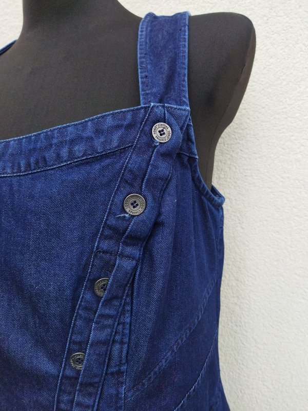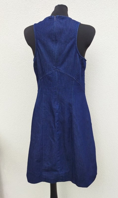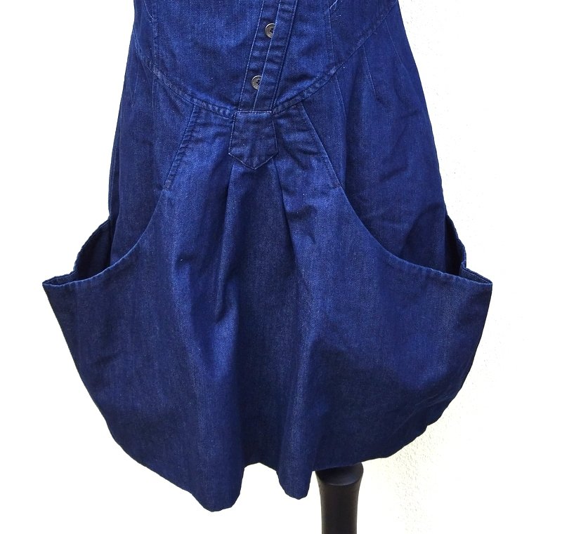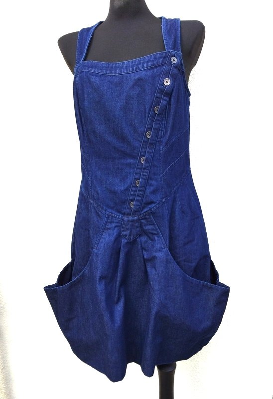 Jeansowa sukienka o ciekawym kroju w ciemnogranatowym kolorze. Góra dopasowana z imitacją asymetrycznego zapięcia na sygnowane guziki. dół trapezowy z głębokimi odstającymi kieszeniami, z wszytą gumą po bokach dołu. Na podszewce zszytej z sukienką