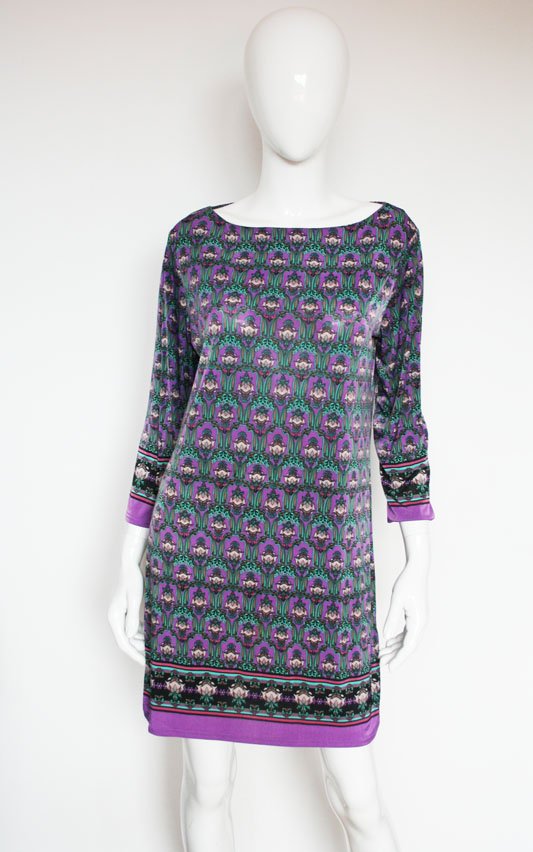 Piękna, wzorzysta sukienka-tunika Atmosphere. Elastyczna i sprężysta. Dół oraz rękawy wykończone fioletowym jednolitym materiałem. Sukienka w fantastycznych kolorach.