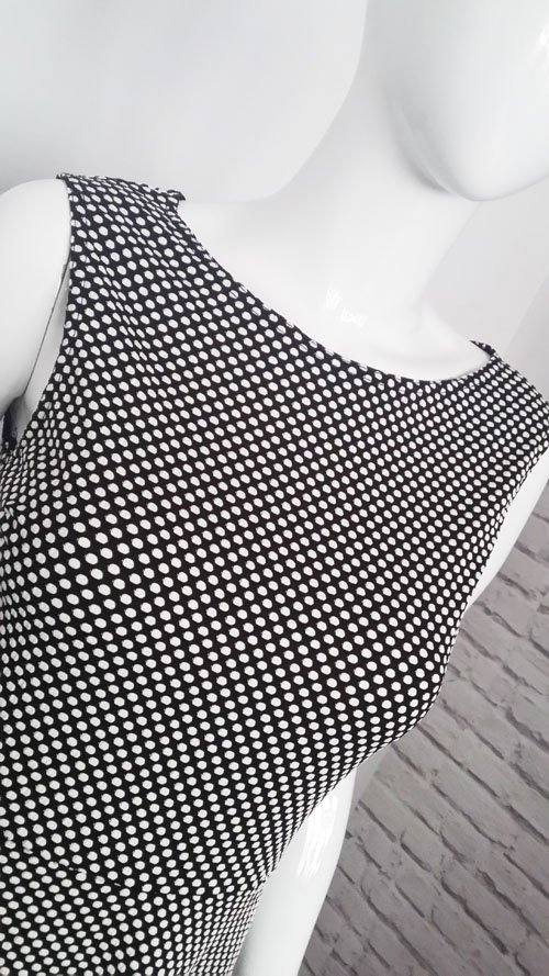 Wyjątkowa sukienka w groszki. Od pasa rozszerzana. W pasie szlufki. Sukienka uszyta z elastycznego, tłoczonego materiału. Wygląda cudownie!