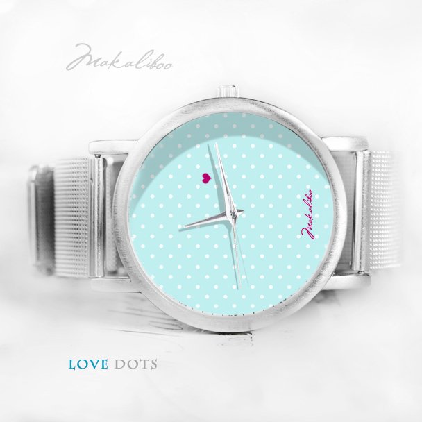 Niepowtarzalny, autorski zegarek z limitowanej kolekcji "Dots" z serduszkiem. Wielkość tarczy zegarka 36 mm, szerokość paseczka 20 mm.