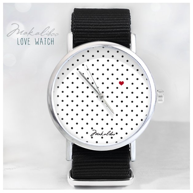 Niepowtarzalny, autorski zegarek z limitowanej kolekcji "Love Watch". Wielkość tarczy zegarka 38 mm, szerokość paseczka 20 mm. Pasek w stylu militarnym wykonany z tkaniny zapinany na tradycyjną klamerkę. Pasuje na nadgarstek 13,5 - 20 cm.