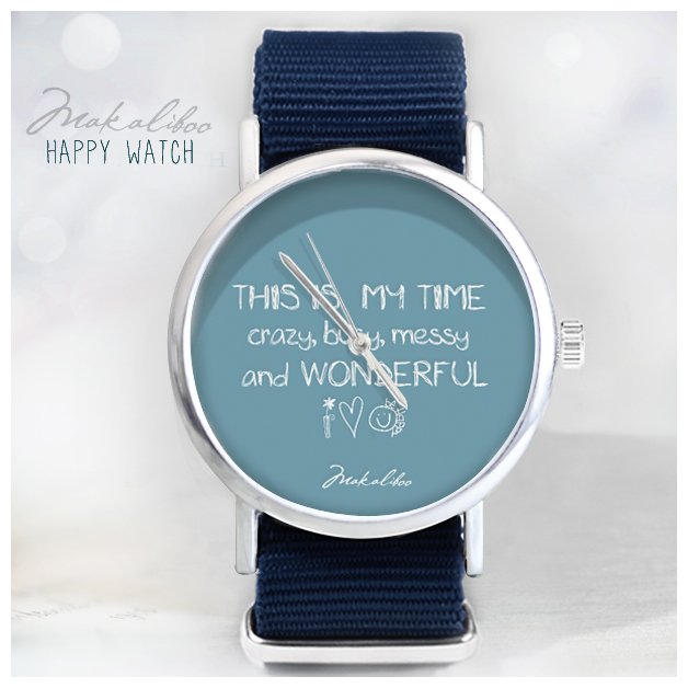 Niepowtarzalny, autorski zegarek z limitowanej kolekcji "Happy Watch". Wielkość tarczy zegarka 38 mm, szerokość paseczka 20 mm. Pasek w stylu militarnym wykonany z tkaniny zapinany na tradycyjną klamerkę. Pasuje na nadgarstek 13,5 - 20 cm.