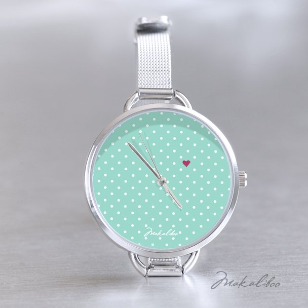 Niepowtarzalny, autorski zegarek z limitowanej kolekcji "Dots" z serduszkiem. Wielkość tarczy zegarka 36 mm, szerokość paseczka 8 mm.