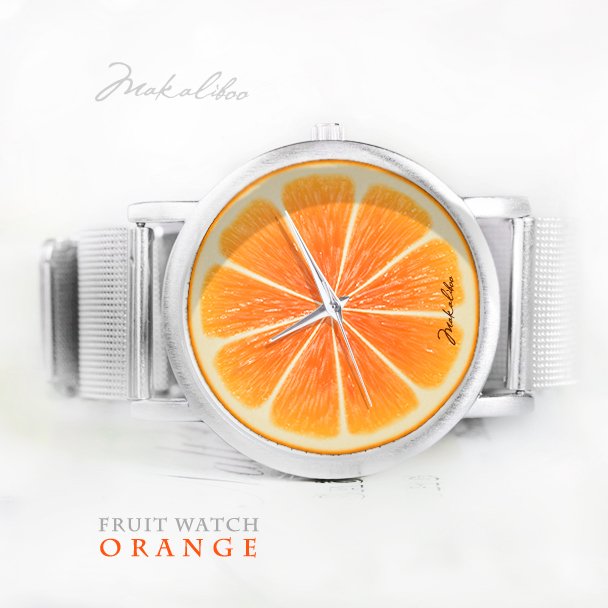 Niepowtarzalny, autorski zegarek z limitowanej kolekcji "Fruit Watch". Wielkość tarczy zegarka 36 mm, szerokość paseczka 20 mm. Pasek to stalowa bransoletka zapinana na tradycyjną klamerkę. Pasuje na nadgarstek 15- 19,5 cm.