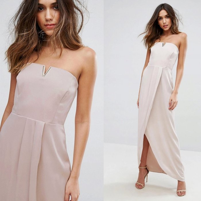 Elegancka sukienka maxi z lejącej matowej wiskozy na podszewce, w kolorze jasnego beżu wpadającego lekko w róż (troszkę ciemniejszy i cieplejszy niż na zdjęciach). Góra w formie dopasowanego, usztywnionego gorsetu, wykończonego metalową kształtką, nie ma mowy o zsuwaniu się ze względu na wszyte wewnątrz fiszbiny. Z tyłu zamek kryty. Dół w formie kopertowej, z klasyczną podszewką przed kolano. Sukienka układa się bardzo ładnie, góra jest stabilna, całość lekko elastyczna. Świetna propozycja na specjalną okazję. Materiały wysokiej jakości.
