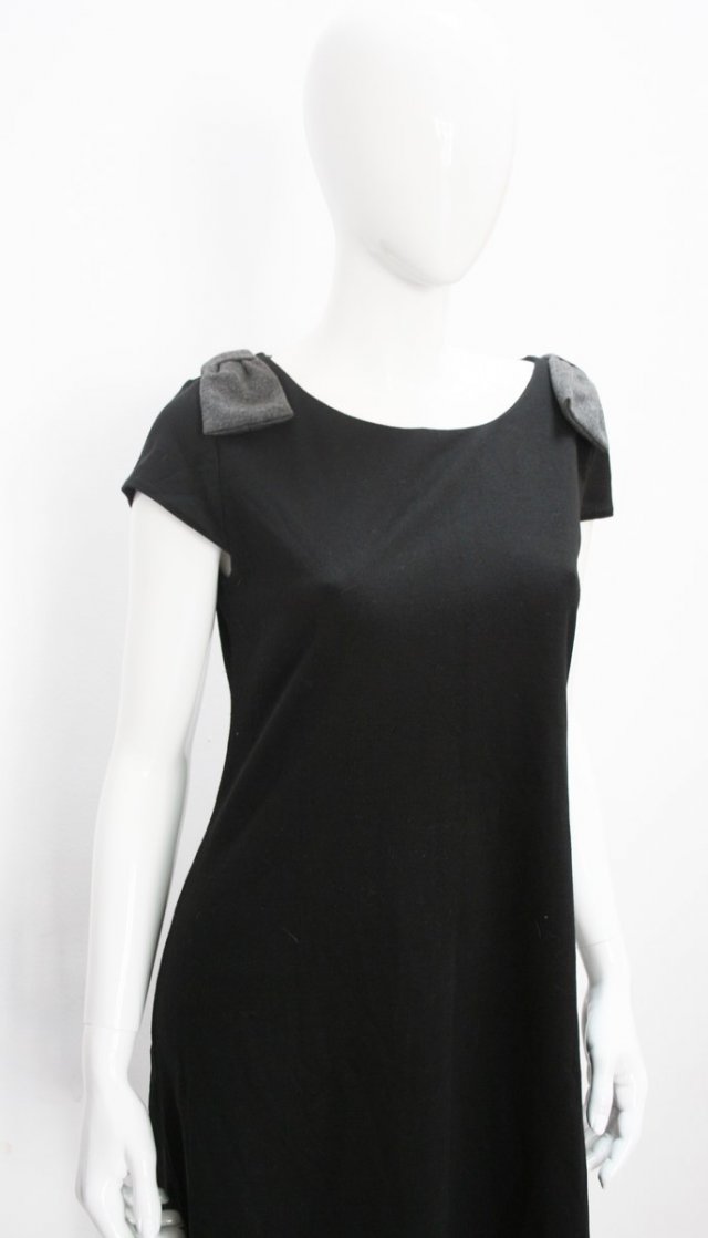 Dzianinowa tunika sukienka. Na ramionach doszyte szare kokardki. Krój prosty.