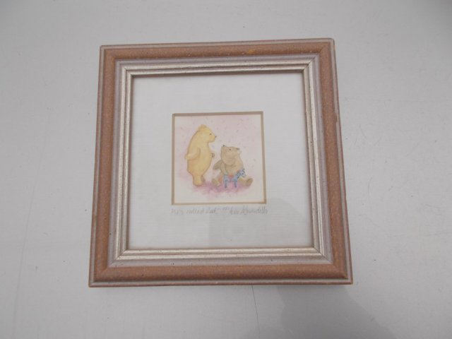 Piękna Ozdoba do Dziecięcego Pokoju. Numer 151 z limitowanej edycji 850 printów akwareli autorstwa LAURY SWINDELLS. Wartość kolekcjonerska i artystyczna. Oryginalne sygnowanie na awersie - podpis autorki, numery 151/850 i....tytuł - "He's called Red" Urocze Misie, delikatne barwy. Oryginalna oprawa z nalepką od spodu. Passpartou i ramka drewniana kolorystycznie dobrane idealnie do obrazka. Szybka. Bardzo piękne ;)