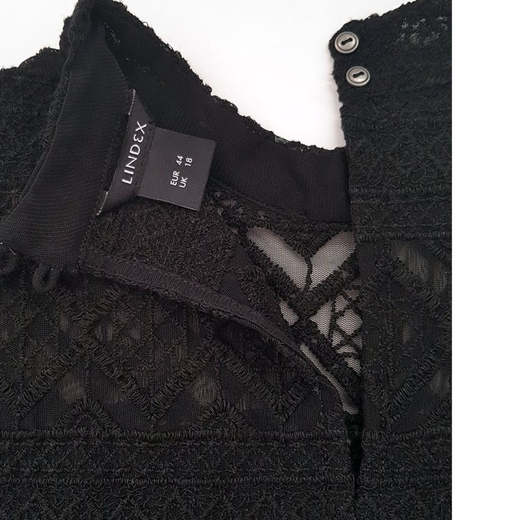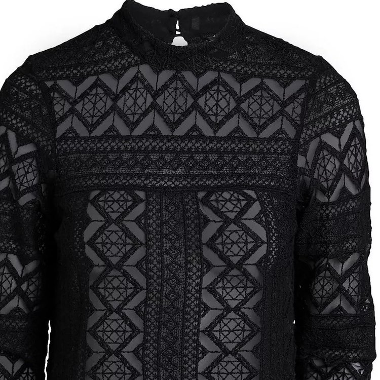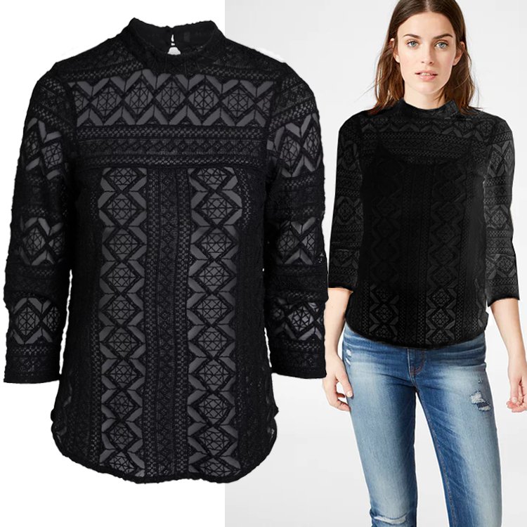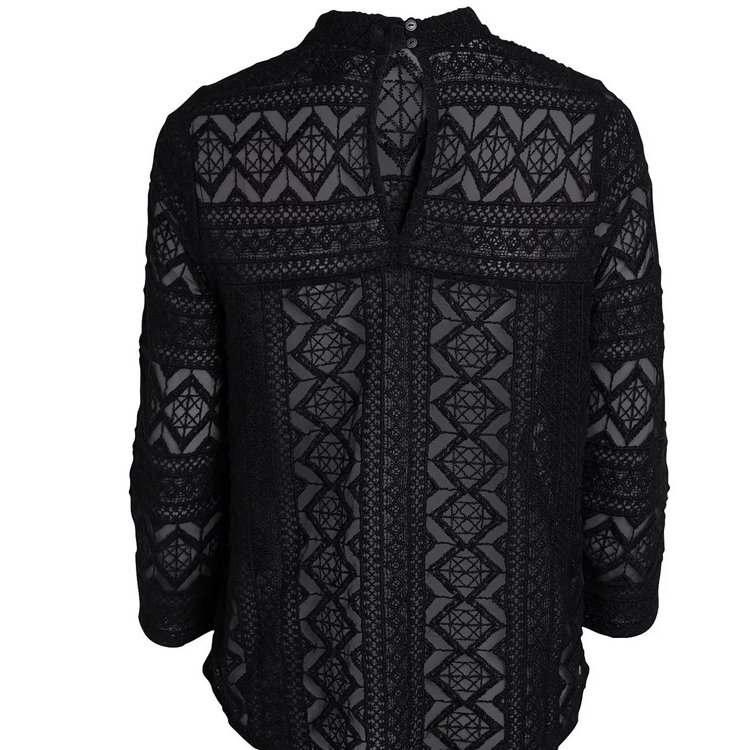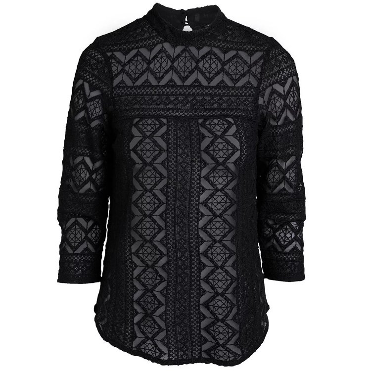 Stylowa bluzka z wysokogatunkowej koronki w geometryczne wzory, prosty krój, dekolt wykończony niską stójką, z tyłu zapinaną na metalowe guziki, dół półokrągły, rękawy 3/4. Można nosić z halką pod spodem, chociaż nie jest to niezbędne, wystarczy czarny biustonosz, koronka jest wystarczająco gęsta.