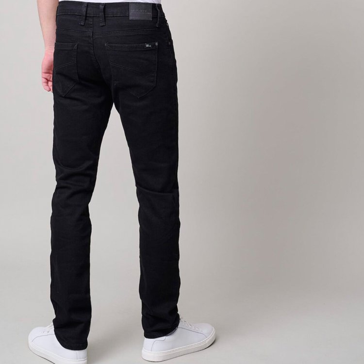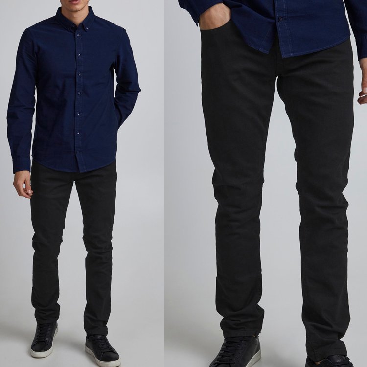 Męskie spodnie dżinsowe w kolorze czarnym marki BLEND, nogawki długie, zwężane do dołu, jeans wysokiej jakości, dość gruby, przyjemny, miękki z dodatkiem elastanu, lekko naddaje się, rozporek zapinany na metalowe guziki. Do produkcji tego produktu użyto bawełny wyprodukowanej w sposób zrównoważony, certyfikowanej przez BETTER COTTON INITIATIVE (BCI). Wszechstronny krój dający wiele możliwości stylizacji, sprawdzi się zarówno w stylu casualowym z T-shirtem, topem lub kardiganem, czy w zestawieniu klasycznym z koszulą lub swetrem z dzianiny.