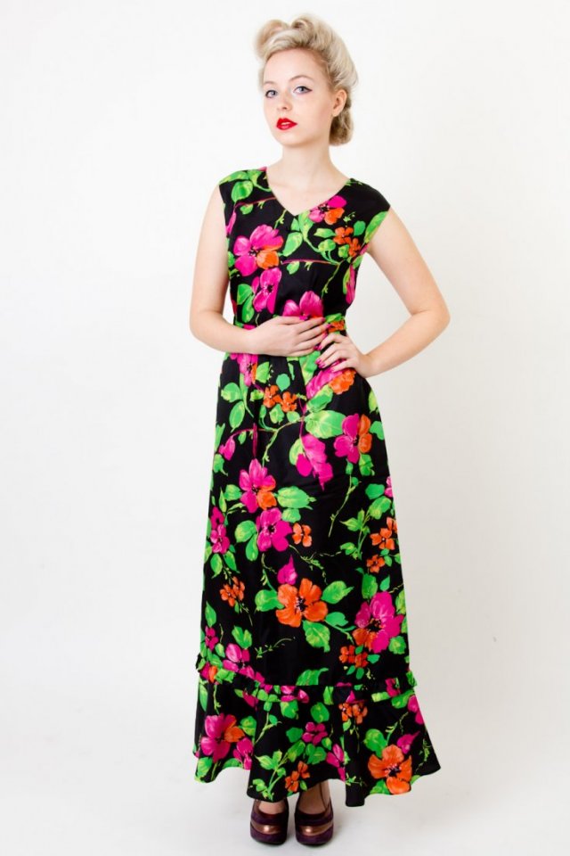 Długa czarna sukienka vintage z lat 70 w kolorowe kwiaty, zapinana z tyłu na zamek. Modelowana za pomocą zaszewek. Ozdobiona z przodu guziczkami oraz paskiem, odcinana w talii, z podszewką. Na dole dwie falbanki - jedna szeroka, druga wąska.