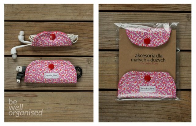 Zestaw dwóch uchwytów na kabelki. Mniejszy np. na słuchawki, a większy na ładowarkę czy kabel USB. Zamykane na zatrzaski. Świetne, żeby zapanować nad ładem w torebce :).