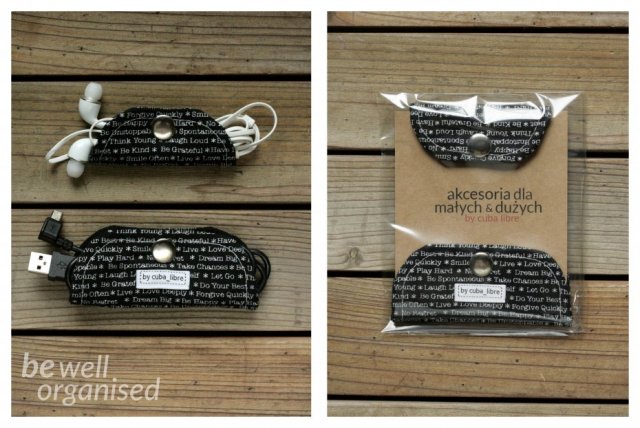 Zestaw dwóch uchwytów na kabelki. Mniejszy np. na słuchawki, a większy na ładowarkę czy kabel USB. Zamykane na zatrzaski. Świetne, żeby zapanować nad ładem w torebce :).
