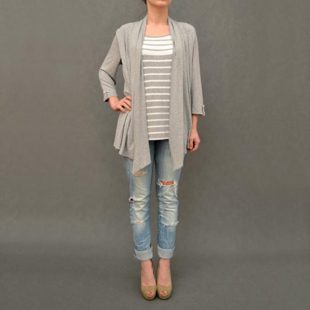 Bluzeczka w paski z szarą narzutką jako nierozerwalna całość. Nie da się nosić osobno. Miła tkanina.