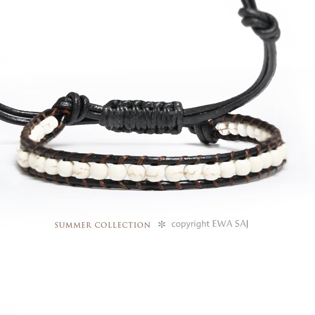 W promocyjnej cenie delikatna, delikatna, piękna, kobieca bransoletka wykonana z 4 mm koralików jasnego howlitu oraz skórzanego czarnego rzemyka o grubości 1 mm. Zaciskowe zapięcie pozwala na dostosowanie wielkości do każdego nadgarstka. Idealna na nadgarstek 13-17 cm.