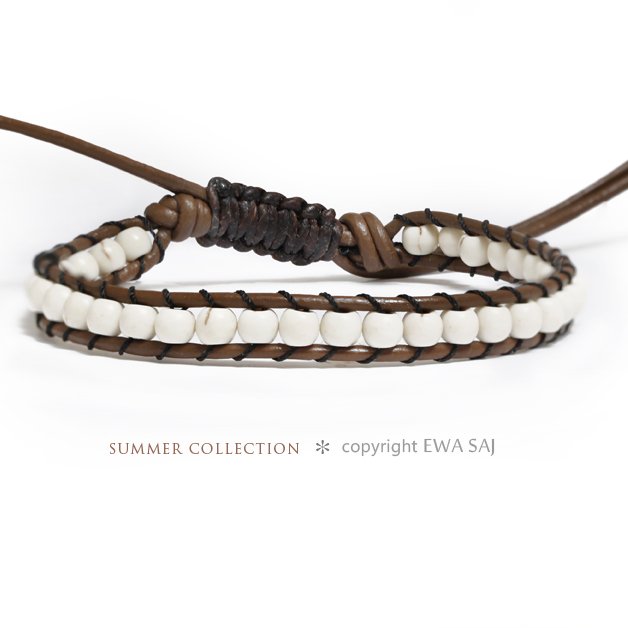 W promocyjnej cenie delikatna, delikatna, piękna, kobieca bransoletka wykonana z 4 mm koralików jasnego howlitu oraz skórzanego brązowego rzemyka o grubości 1 mm. Zaciskowe zapięcie pozwala na dostosowanie wielkości do każdego nadgarstka. Idealna na nadgarstek 13-17 cm.