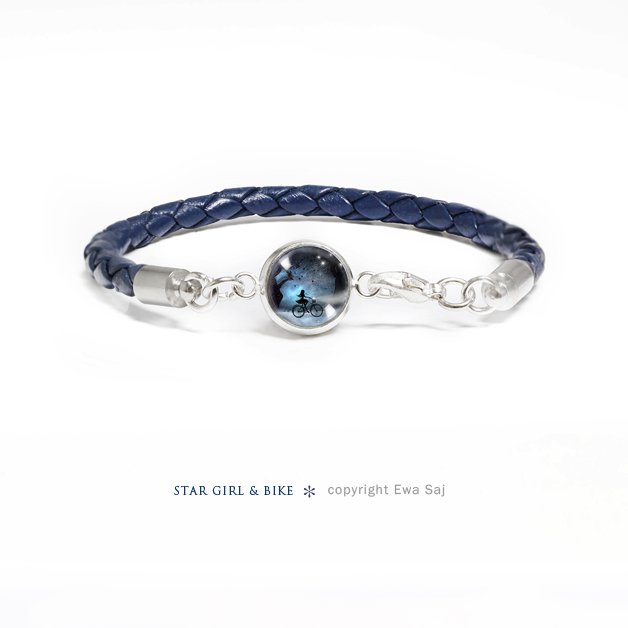 W promocyjnej cenie, oryginalna delikatna, kobieca bransoletka z kolekcji Star Girl Classic. Grafika została ukryta pod 10 mm wypukłym szkiełkiem. Skórzany pleciony rzemień w kolorze granatowym ma średnicę 4 mm , dodatki w kolorze srebra. Idealna na nadgarstek 14,5 - 15,5 cm.