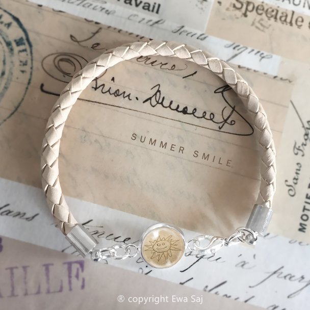 W promocyjnej cenie, oryginalna delikatna, kobieca bransoletka z kolekcji Summer. Grafika została ukryta pod 10 mm wypukłym szkiełkiem. Skórzany pleciony rzemień w kolorze beżowym ma średnicę 4 mm , dodatki w kolorze srebra. Idealna na nadgarstek 14,5 - 15,5 cm.