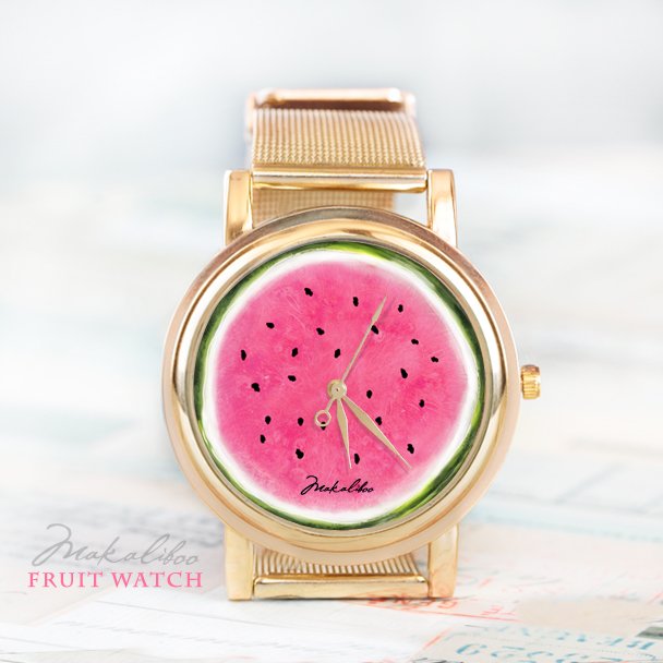 Niepowtarzalny, autorski zegarek z limitowanej kolekcji "Fruit Watch". Wielkość tarczy zegarka 41 mm, szerokość paseczka 20 mm. Pasek to stalowa bransoletka zapinana na tradycyjną klamerkę. Pasuje na nadgarstek 15- 19 cm.