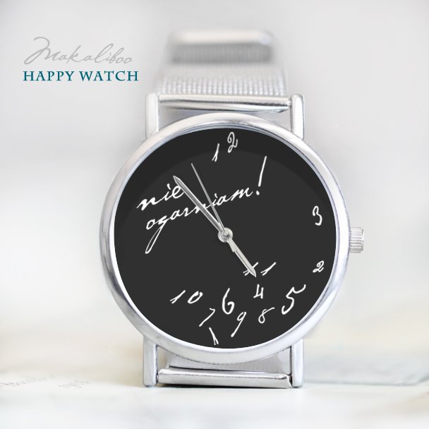 Niepowtarzalny, autorski zegarek z limitowanej kolekcji "Happy Watch". Wielkość tarczy zegarka 36 mm, szerokość paseczka 20 mm. Pasek to stalowa bransoletka zapinana na tradycyjną klamerkę. Pasuje na nadgarstek 15- 19 cm.