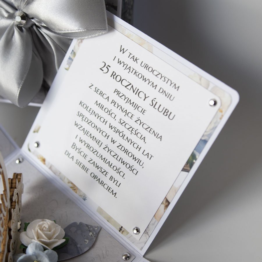 Ręcznie robiona kartka z okazji 25 rocznicy ślubu w formie rozkładanego pudełeczka.