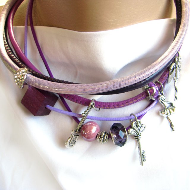 BRANSOLETKA do 2-krotnego owinięcia lub NASZYJNIK, wykonana z grubych rzemieni szytych w kolorach:złoto-liliowym, fioletowym oraz fioletowych woskowanych sznurków bardzo dobrej jakości, korali: ceramicznego, drewnianego, modułowego typu pandora, srebrnych przekładek oraz przekładki pierścionka z cyrkoniami oraz dowieszek charmsów: kluczyka, pistoletu, baletnicy i gitary. Zapięcie ozdobne w kształcie kwiatka. Do 2-krotnego owinięcia wokół nadgarstka. Długość 42 cm, będzie idealna na nadgarstek 15-17 cm.