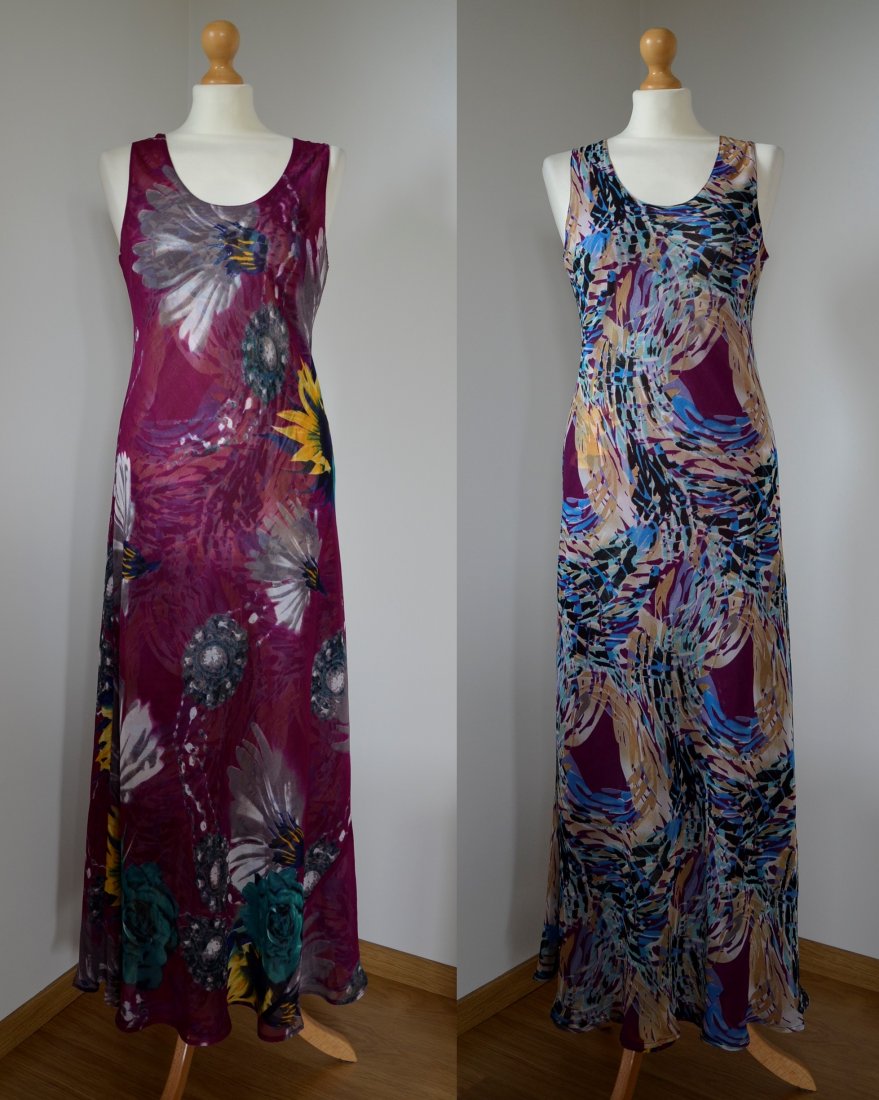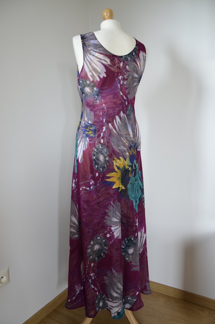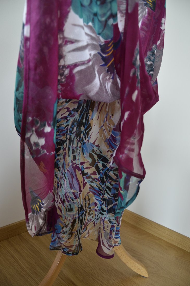 sukienka uszyta jest z 2 warstw materiału w taki sposób, że po przewróceniu na drugą stronę mamy inną sukienkę (dlatego sukienka nie ma metek ze składem i rozmiarem; wszyte są jedynie tasiemki w okolicach pach co widać na jednym ze zdjęć ale można je obciąć); wg mnie jest to wiskozowa żorżeta; sukienka jest lekko prześwitująca, można założyć halkę;