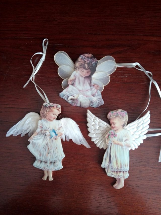 Piękne porcelanowe aniołki z limitowanej kolekcji The Bradford Editions. Rzadkość na rynku. Każdy z aniołków posiada indywidualny numer seryjny .Precyzyjne wykonanie. Rant złocony. Skrzydła z piór oraz materiału satynowego. 1998 BY DONNA GELSINGER - HEAVEN’S LITTLE ANGELS ORNAMENTS - KOLEKCJONERSKIE PORCELANOWE ZAWIESZKI. Anioł siedzący -skrzydełka ze złotego drucika ,obleczone siatkowym materiałem.Sygnowany 'Loving Kindness' by Donna Brooks Second issue Heaven;s Little Angels Ornaments No.0059 Bradford Editions 68681.Stan bardzo dobry,wysokość 9,3 cm.szerokość 11 cm.Aniołek stojący z niebieskim ptakiem:skrzydełka z prawdziwych piórek,sygnowany ;Gentle Guardian:by Dona Gelsinger First issue Heaven,s Little Angels Ornaments No.0059 Bradford Editions 68681.Stan bardzo dobry,wysokość 13,5 cm.szerokość 14 cm.Aniołek z kwiatkami,skrzydełka z materiału,sygnowany Garden Miracle:" by Dona Gelsinger Third issue Heaven,s Little Angels Ornaments No.0059 Bradford Editions 68681.Wysokość 13,5 cm.szerokość 11 cm.Stan bardzo dobry.