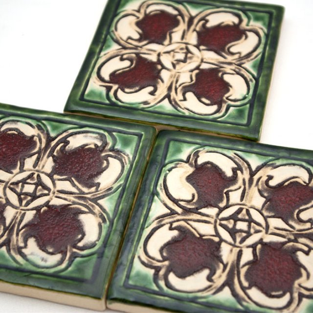 Kafle przedstawiają ciemno-czerwone kwiaty w zielonych ramach.