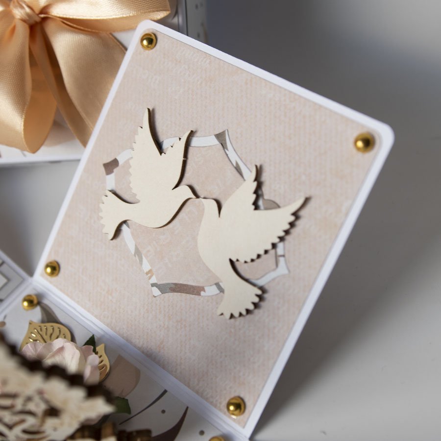 Na środku pudełeczka znajduje się dekoracja z papierowymi kwiatuszkami, na ściankach motyw serca, życzenia dla solenizantów, miejsce na podpis oraz dwa gołąbki